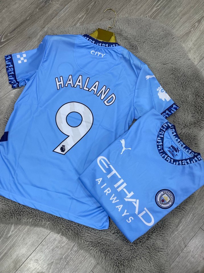 Mavi renkli, kısa kollu ve regular fit erkek forması. Sentetik kumaştan üretilmiş, Haaland ve 9 numara baskılı, düğmeli ve sokak giyimine uygun.