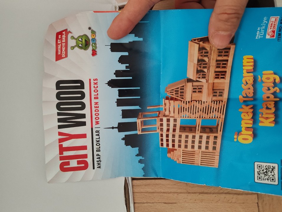 City Wood ahşap bloklar model kiti, detaylı mimari yapı oluşturmak için tasarlanmıştır. Açık mavi kutu üzerinde şehir silueti görseli yer alır. ️