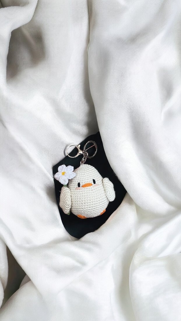 Renkli örgü, beyaz kuş figürlü ve küçük çiçek detaylı kadın anahtarlık, sokak stili için uygun. Civciv çanta charmı. 10cm