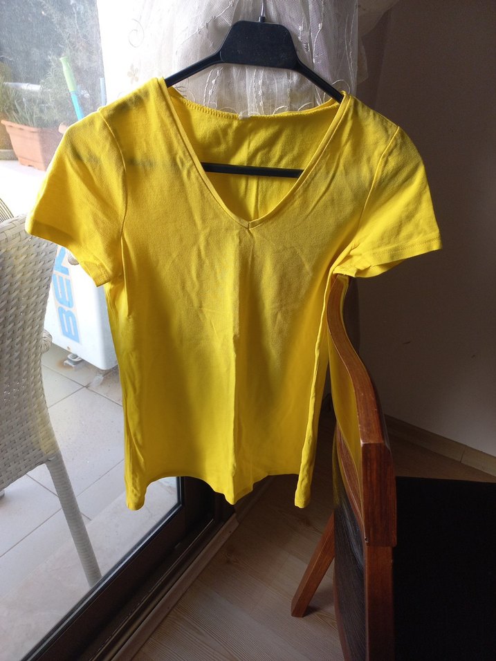 Sarı renkli, V yakalı ve kısa kollu kadın tişörtü. Düz kesimli, normal midi boyunda ve rahat sentetik kumaştan üretilmiştir. Günlük kullanıma uygundur. hiç bir kusuru yoktur.