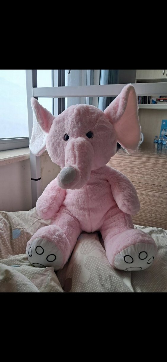 70 cm yumuşak pastel pembe renkte, büyük kulaklı ve detaylı ayaklara sahip peluş fil oyuncak.
