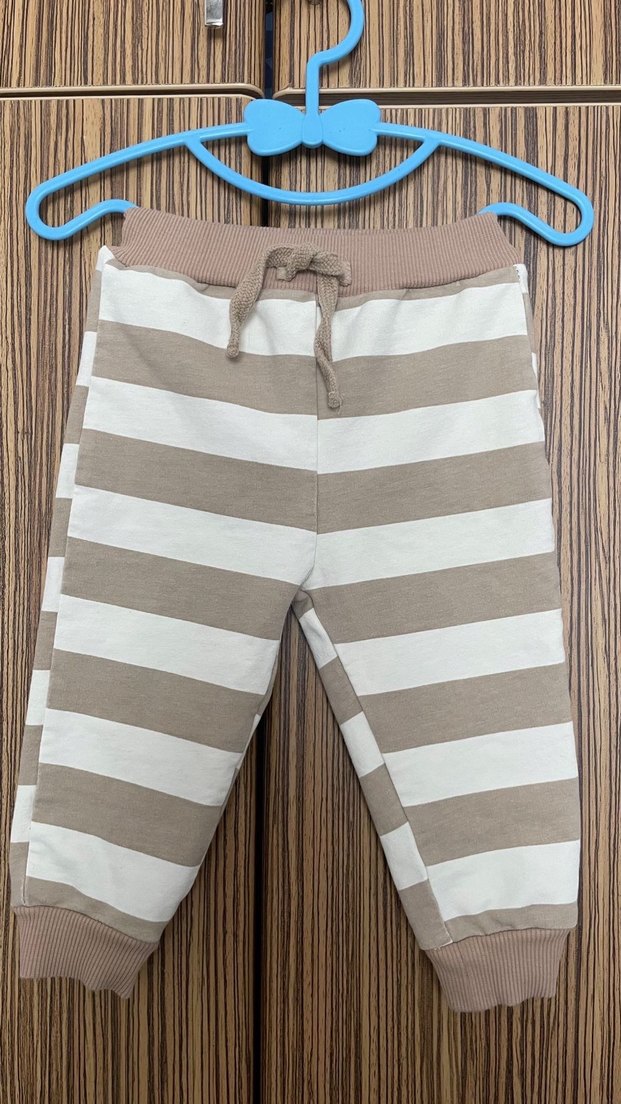 Bej ve beyaz çizgili, bol kesim erkek çocuk pantolonu, elastik bel ve bağcıklı, rahat ve yumuşak sentetik kumaştan üretilmiştir. 9-12 Ay