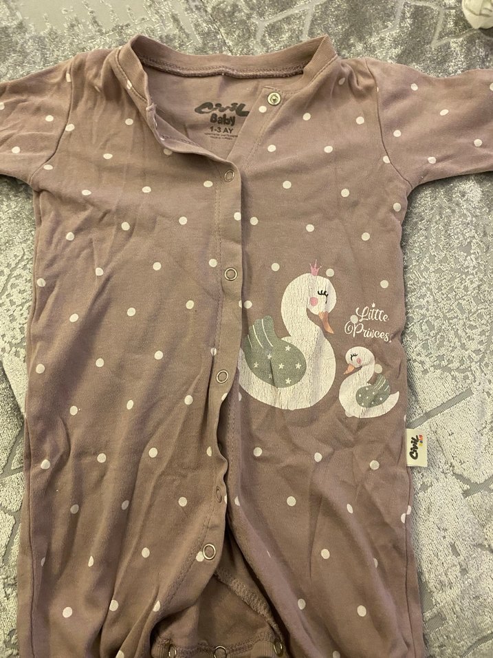 Civil Düğmeli, renkli ve puantiyeli baskılı bebek kız tulumu. Yumuşak ve rahat kumaşla yapılmıştır. Pamuklu patikli kullanılmadı ama dolapta durduğundan katlamaya bağlı baskıda açıklık hafif oluştu