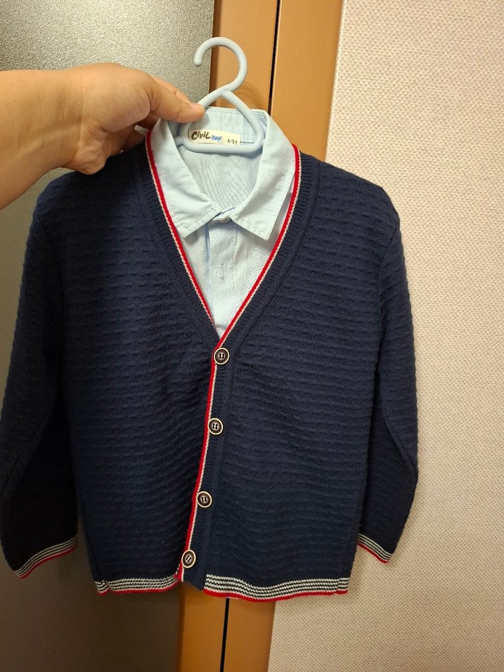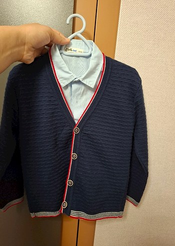 ikili takım, bayramda kullandık öylece dolapta asılıydı yeniden farksız.Erkek çocuklar için düğmeli, yakalı ve uzun kollu triko hırka. Lacivert renkte, kırmızı ve beyaz şerit detaylı, trendi ve rahat bir tarz sunar.