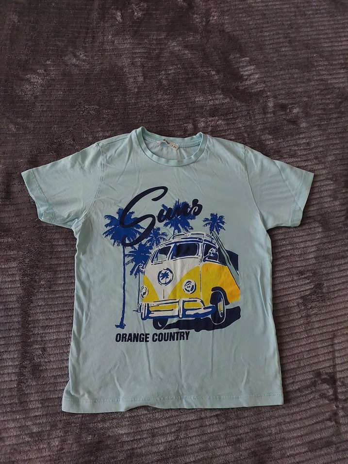 Pamuklu, pastel mavi renkli, baskılı retro van ve palmiye ağaçları desenli, bol kesim erkek kısa kollu tişört. Üzerinde 'ORANGE COUNTRY' yazısı bulunur.