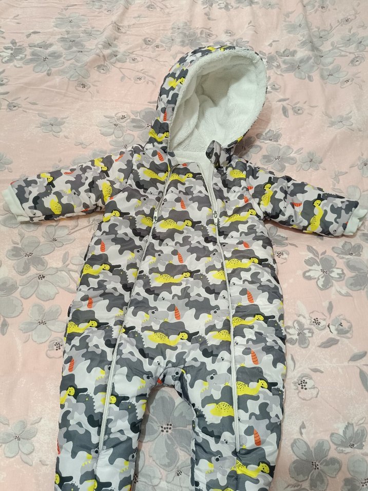 Gri kamuflaj desenli, sarı detaylı bebek tulumu, yumuşak kumaş ve kürklü kapüşon ile sıcak tutar. Streetwear tarzında.