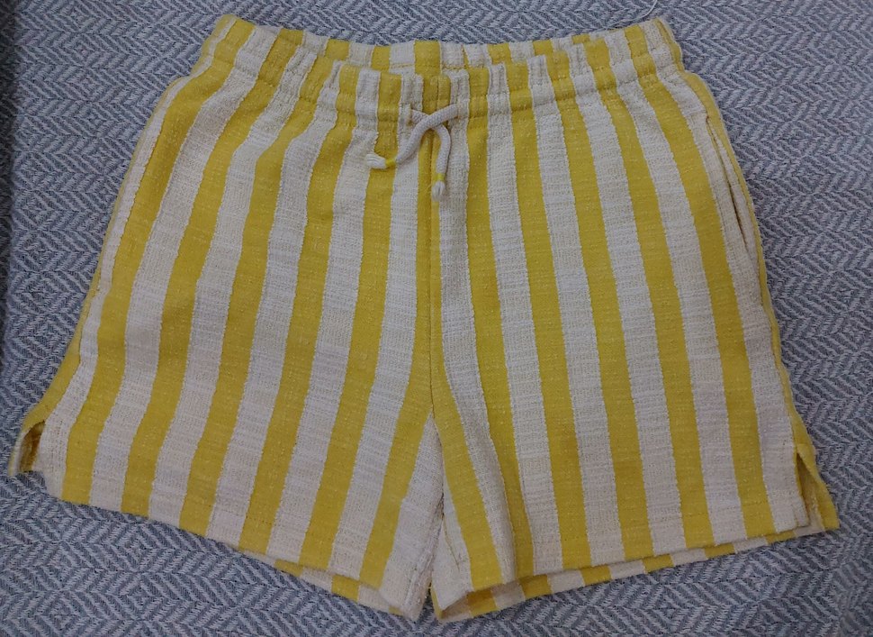 Civil marka, sari beyaz çizgili, beli lastikli, cepli kız çocuk şort. 9-10 yaş etiketli ama bence 7 yaş için ideal.