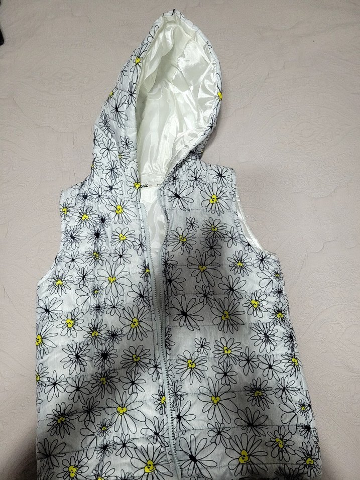 Kız çocuk için kapüşonlu, fermuarlı ve çiçek desenli beyaz renkte, kolsuz yelek. Sokak modasına uygun, dar kesim tarzda.