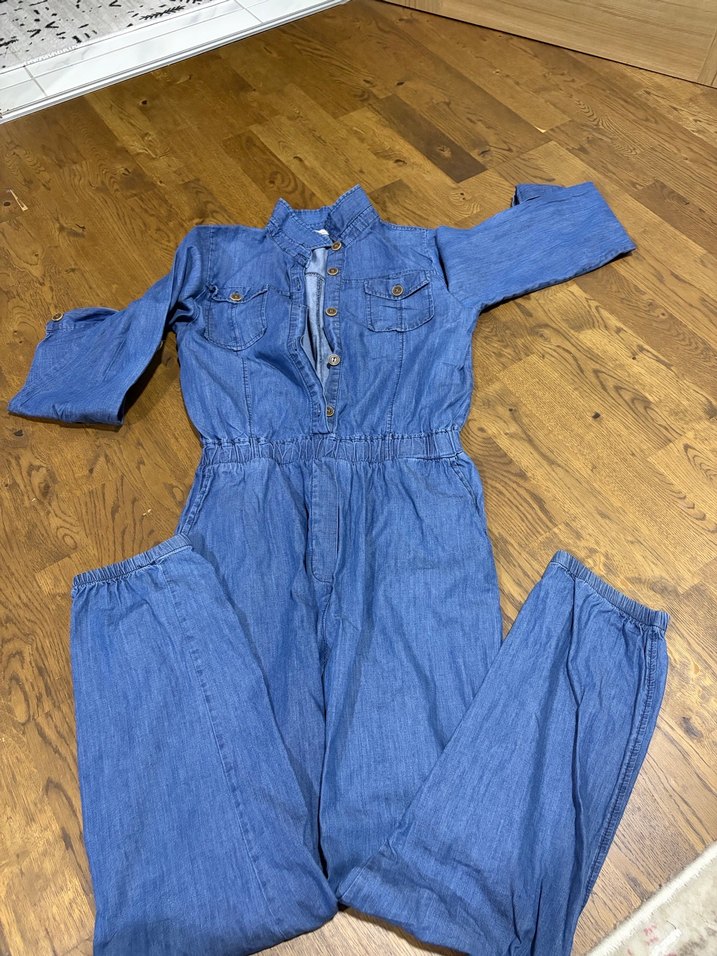Civil Kız çocuk Düğmeli ön ve kesik yakalı, bol kesim uzun mavi denim tulum. Uzun kollu ve günlük kullanıma uygun rahat sokak stili. 13-14 yaş temizdir