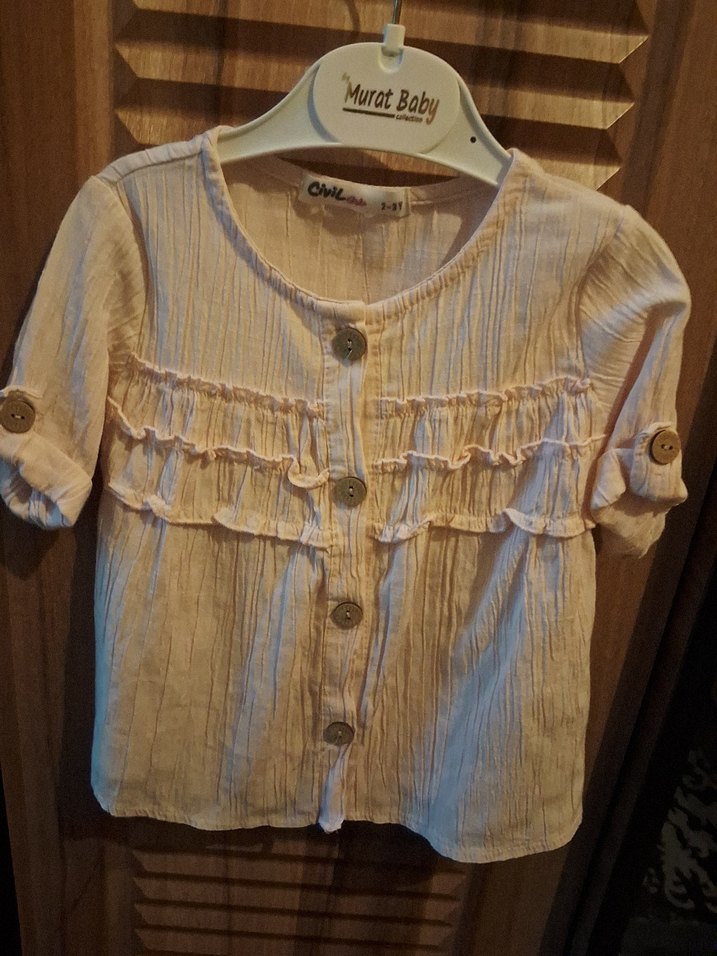Bej renkli keten kumaştan, düğmeli, kısa kollu, yuvarlak yakalı, bol kesim kız çocuk bluzu. Bohem tarzda, hafif fırfırlı detaylı. civil marka
