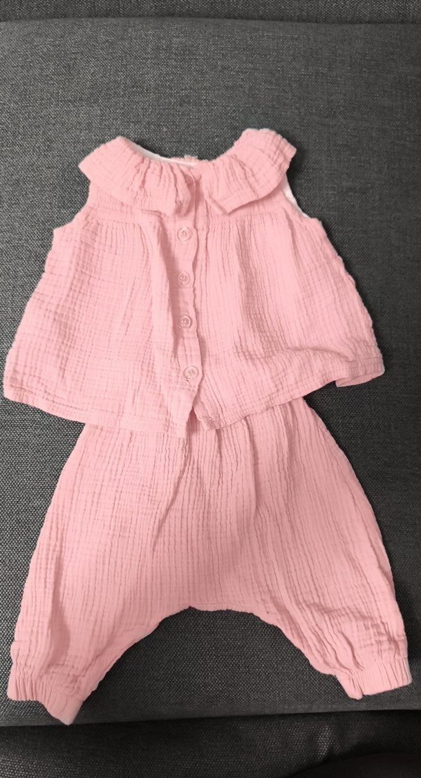 toz pembe renginde. üstü sıfır kollu yaka detaylı düğmeli. alt kısmı bol kesim biraz şalvar tarzında paçaları lastikli. Müslin kumaş. 6-9 ay kız bebekler için uygundur. az kullanılmıştır