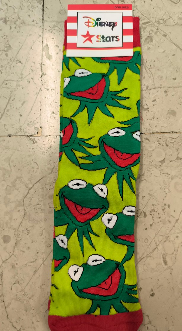 Canlı sarı zeminde yeşil çizgi film yüzlerinin baskılı olduğu renkli çocuk çorabı.