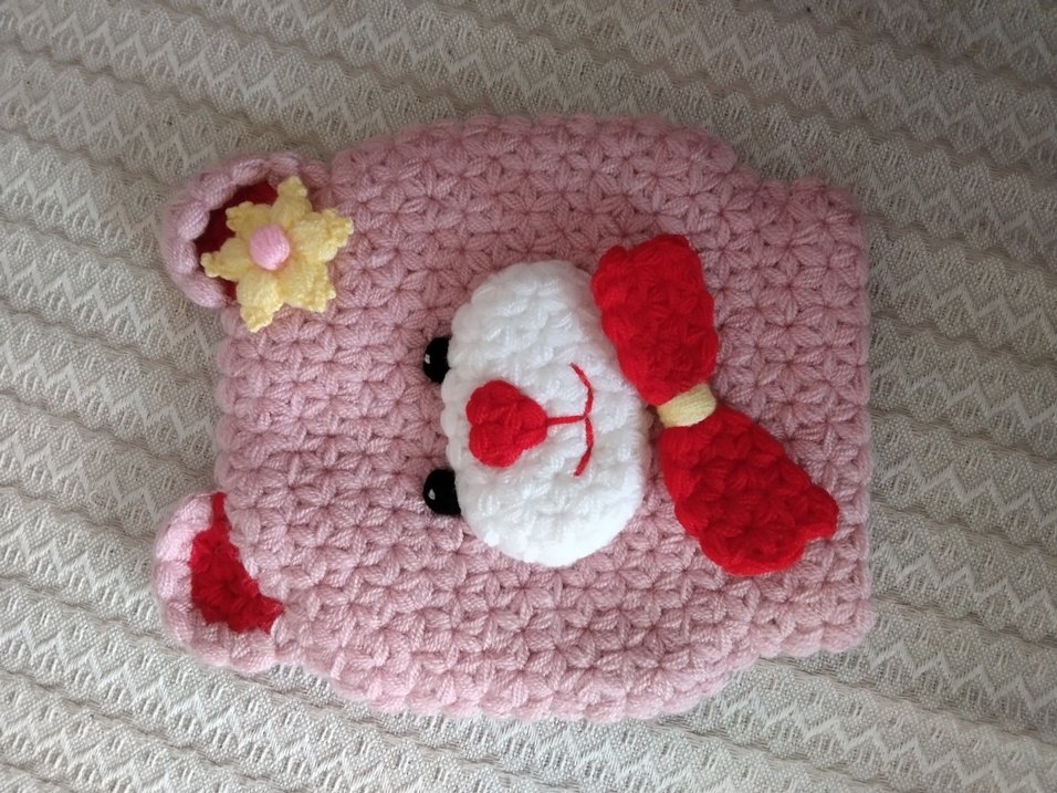 Pembe renkli, el örgüsü yumuşak peluş oyuncak. Beyaz yüzü, kırmızı fiyonk ve sarı çiçek detaylarıyla renkli ve neşeli bir tasarım sunar.