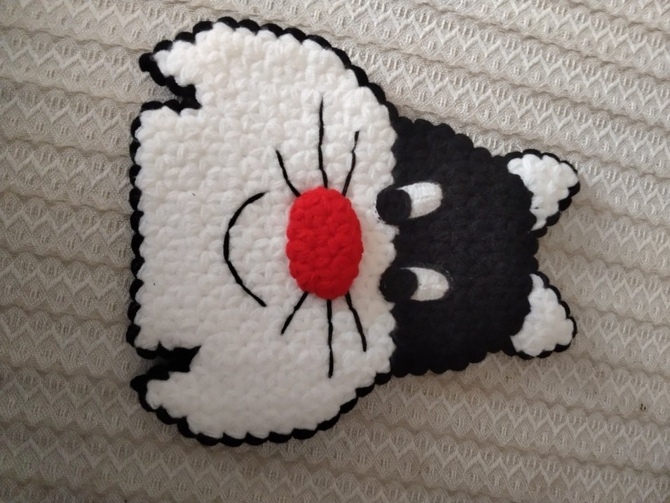 Yumuşak kumaştan, kırmızı burunlu örgü kedi yüzü desenli renkli mouse