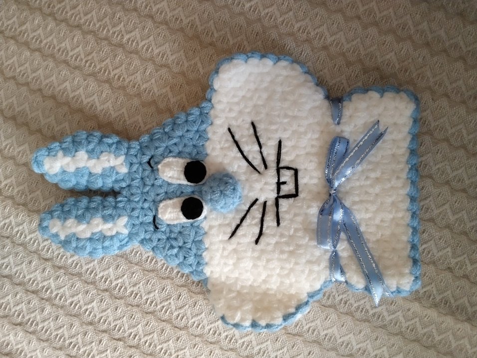 Nakışlı yüz deseni ve kurdele detaylı, pastel mavi renkli örgü, Yumuşak ve rahat bir dokusu vardır.