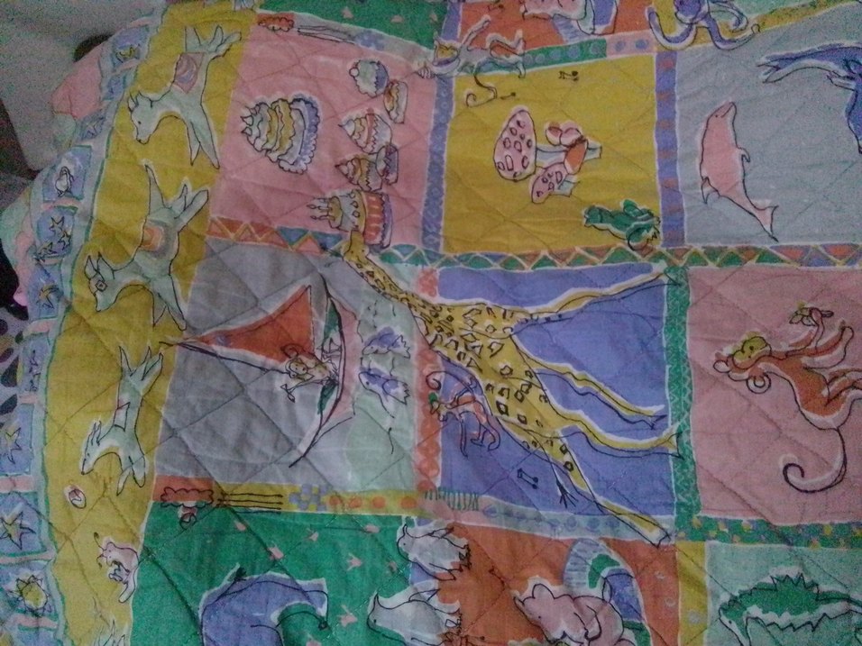 125 cm en // 2 metre boy / SADECE ARKASI TÜYLENMİS // YİRTİK SOKUK LEKE YOKTUR...// UYGUN FİYAT Çocuklar için yumuşak tekstil malzemeden, pastel renklerde baskılı hayvan ve eğlenceli desenlere sahip yatak ortusu