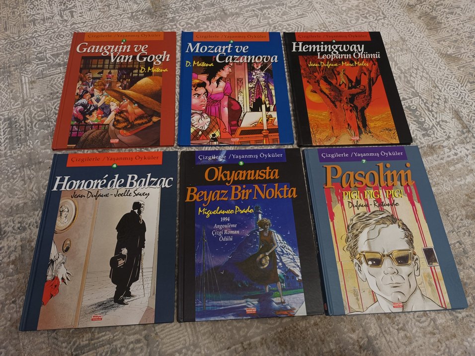 Çizgilerle/Yaşanmış Öyküler Milliyet Yayınları Sert Kapak 6 Kitap (normal seri 7 kitap olup 6. kitap yok sadece) Çok temiz ve kusursuzdur.. Büyük boy kitaplardır 22X29 ebat milliyet yayınlarının çıkardığı ve van gogh, pasolini, sade, mozart, hemingway, balzac'ın hayatlarından ilginç kesitler sunan, tarihi çizgiroman dizisi... bu arada bir kitap, italyan bir çizgiromancının ödül alan okyanusta beyaz bir nokta adlı bunalım ve felsefik çizgiromanına ayrılmıştır... Mozart, Van Gogh, Hemingway ve de Balzac gibi ünlülerin çizgilerle anlatılan yaşam öykülerini içeren çizgi roman kitaplar.. kitaplar ortalama 60 sayfa olup 80 sayfa civarı olan kitap da vardır.