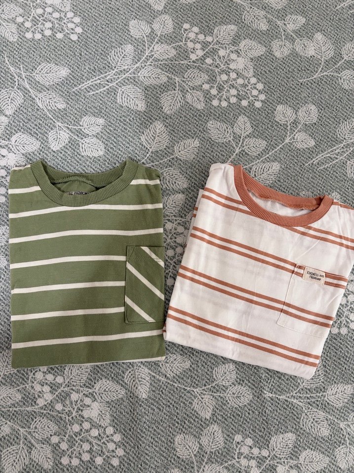 Çizgili desenli, pastel tonlarda çocuk tshirtleri; biri kahverengi, diğeri yumuşak yeşil tonlarında, küçük göğüs cepli. 5 yaş için uygun ikiside aynı boyutta