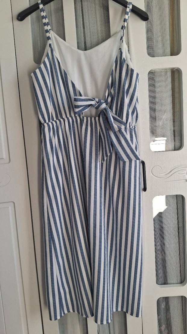 Mavi ve gri çizgili, askılı ve drapeli uzun elbisesi. Yumuşak sentetik kumaştan, rahat bir kesime sahip. Günlük kullanım için uygundur. ,M ,L uyumlu