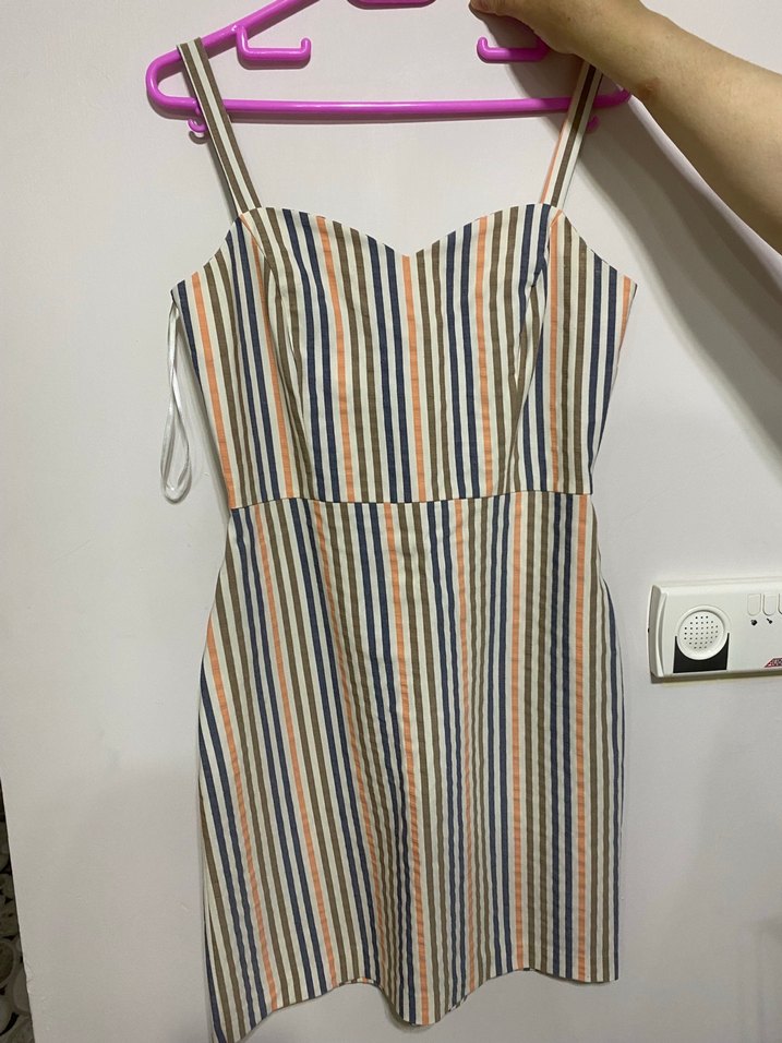Bu askılı, straplez diz üstü elbise, ince askılar ve pileli detaylarla tasarlanmıştır. Hafif, çok renkli çizgili desene sahiptir ve pamuk kumaştan üretilmiştir.