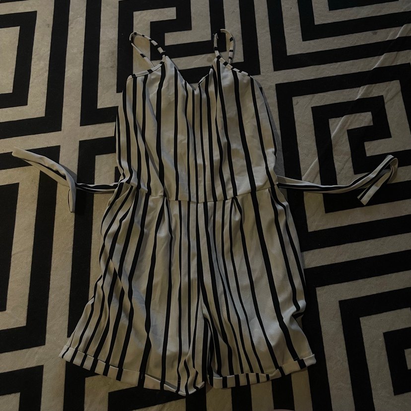 Askılı, çizgili kadın tulum. Kemer tokalı, straplez yaka ve dar kesim. Gri renkte, sentetik kumaştan üretilmiştir. Sokak stili için uygundur.