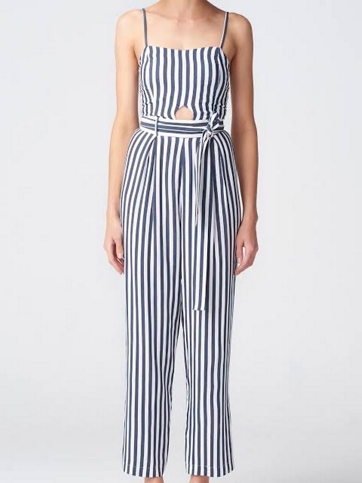 Lacivert ve gri çizgili tulum, ince askılı straplez yaka ve kemerli bel ile rahat kesim sunar. Romantik akşamlar için uygundur.