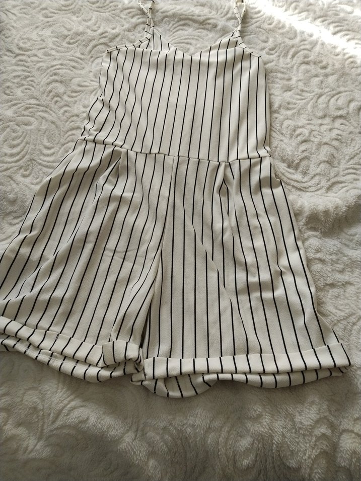 Çizgili, askılı ve pileli detaylara sahip beyaz-gri midi kadın tulumu, rahat ve salaş kesimlidir. Günlük sokak modasına uygundur.