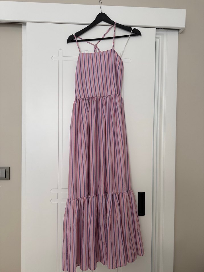 Pastel renklerde, çizgili uzun elbise, pileli detaylara ve askılı straplez yakaya sahiptir. Bol kesimiyle bohem tarzını yansıtır.