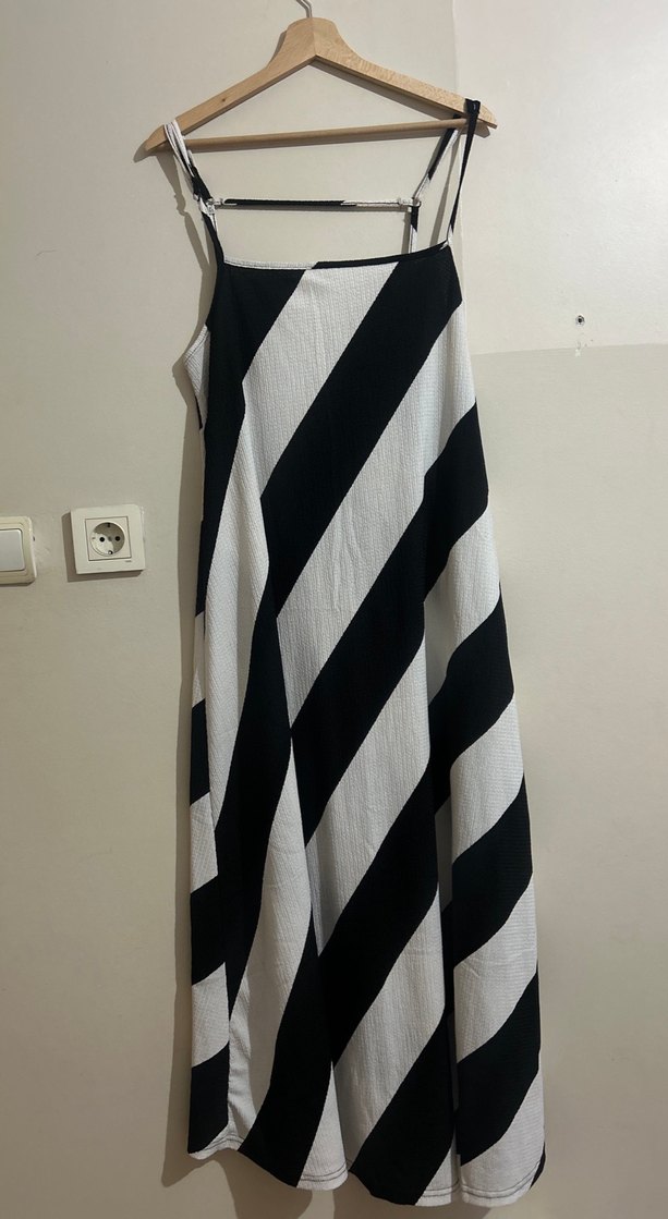 Bu uzun elbise, askılı ve salaş kesimdir. A model Teknolojik kumaştan yapılmış, geniş çizgili ve salaş kesimdir. 1 kez giyildi