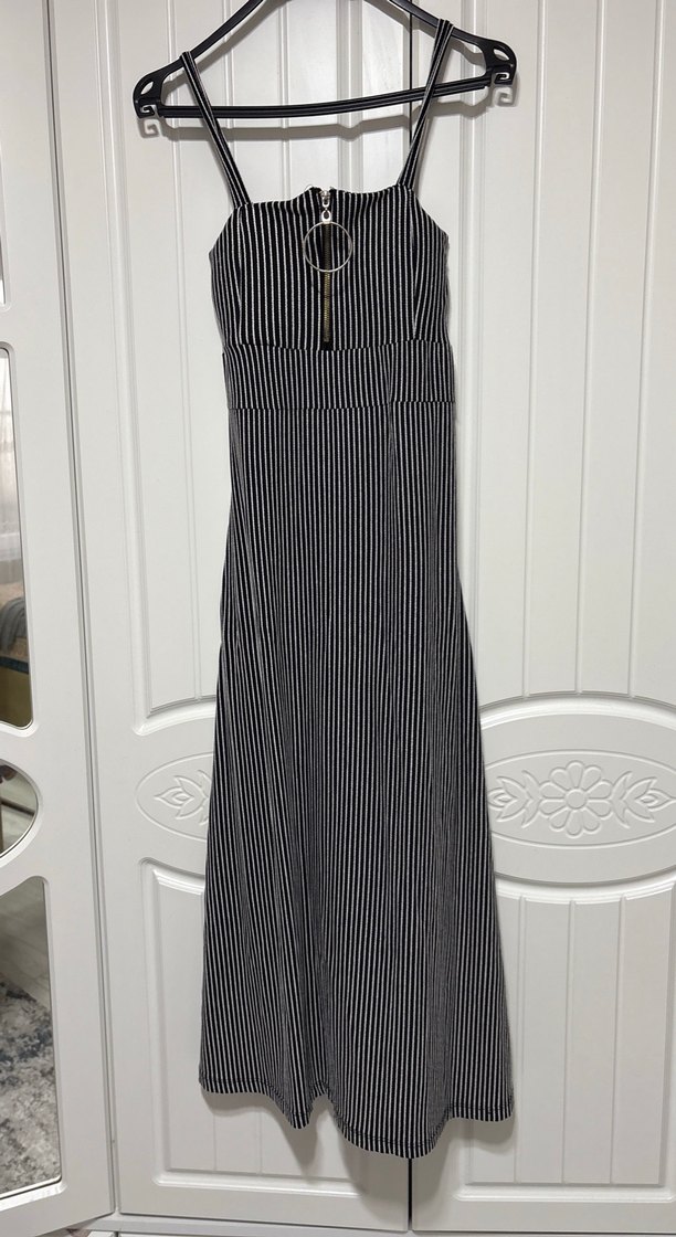 Gri renkli, dikey çizgili, askılı ve straplez yakalı, vücuda oturan uzun tulum. Sentetik kumaştan, pileli detaylı, günlük rahat ve Paris sokak modasına uygun.