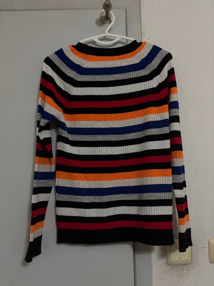 Çok renkli çizgilerle örülmüş, balıkçı yakalı, uzun kollu ve vücuda oturan kadın triko kazak. Normal boyda, günlük ve sokak stiline uygun.