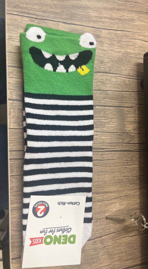 Erkek çocuk çorabı, yeşil zemin üzerine baskılı canavar yüzü ve gri-beyaz çizgili desene sahip. Pamuklu yumuşak kumaştan üretilmiştir. 6 7 yaş