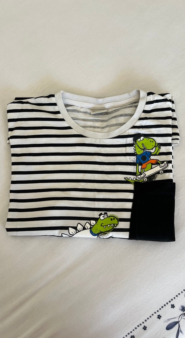 Rahat kesim, kısa kollu ve bisiklet yaka erkek tişörtü. Renkli dinozor baskıları ve cırt cırtlı siyah cep bulunur. Sokak tarzı için uygun.