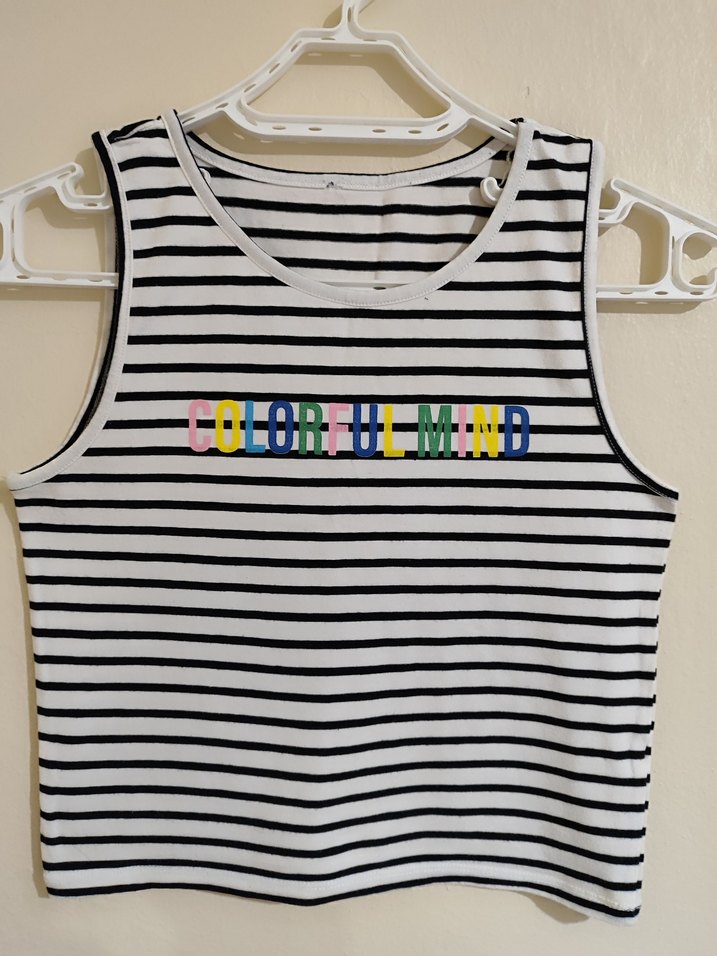 Pamuklu, kolsuz ve kısa kesim bu atlet, renkli baskılı slogan ve çizgili deseniyle şık ve rahat bir görünüm sunar. Günlük kullanım için uygundur.
