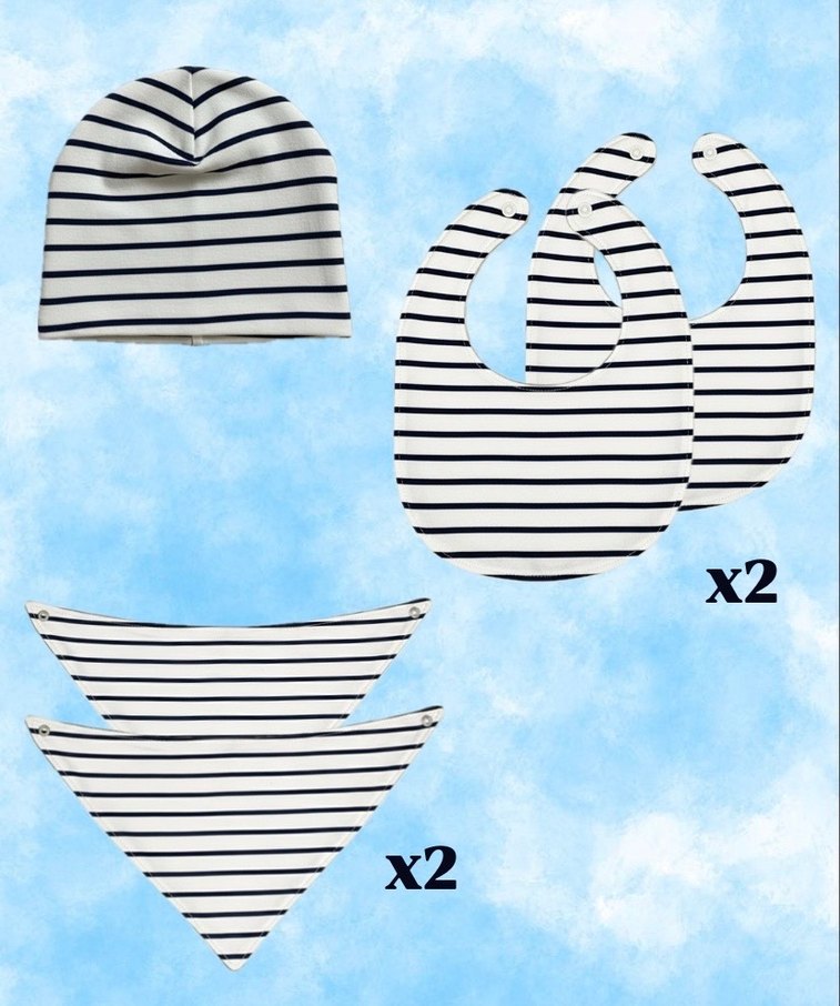 Mavi ve beyaz tonlarda çizgili bebek önlükleri ve şapka seti,1 adet bere, 2 adet önlük ve 2 adet boyunluk içerir. Yumuşak kumaştan üretilmiştir. Ölçüler standarttır.