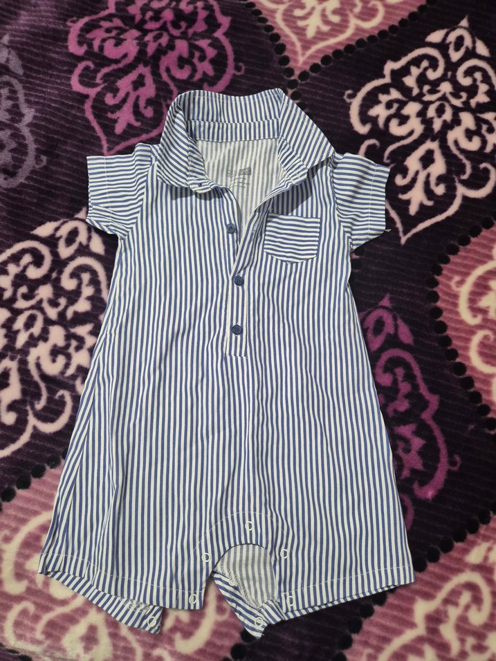 Kısa kollu, yakalı ve düğmeli bebek tulumu. Çizgili desene ve küçük göğüs cebine sahiptir. Sokak tarzı için uygun, yumuşak sentetik kumaştan yapılmıştır.