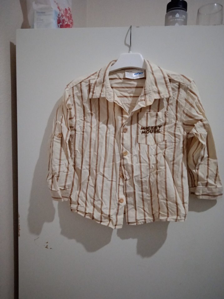 Bej renkli, çizgili erkek çocuk gömleği, düğmeli uzun kollu ve yakalıdır. Rahat ve bol kesim, sokak tarzı için uygundur.