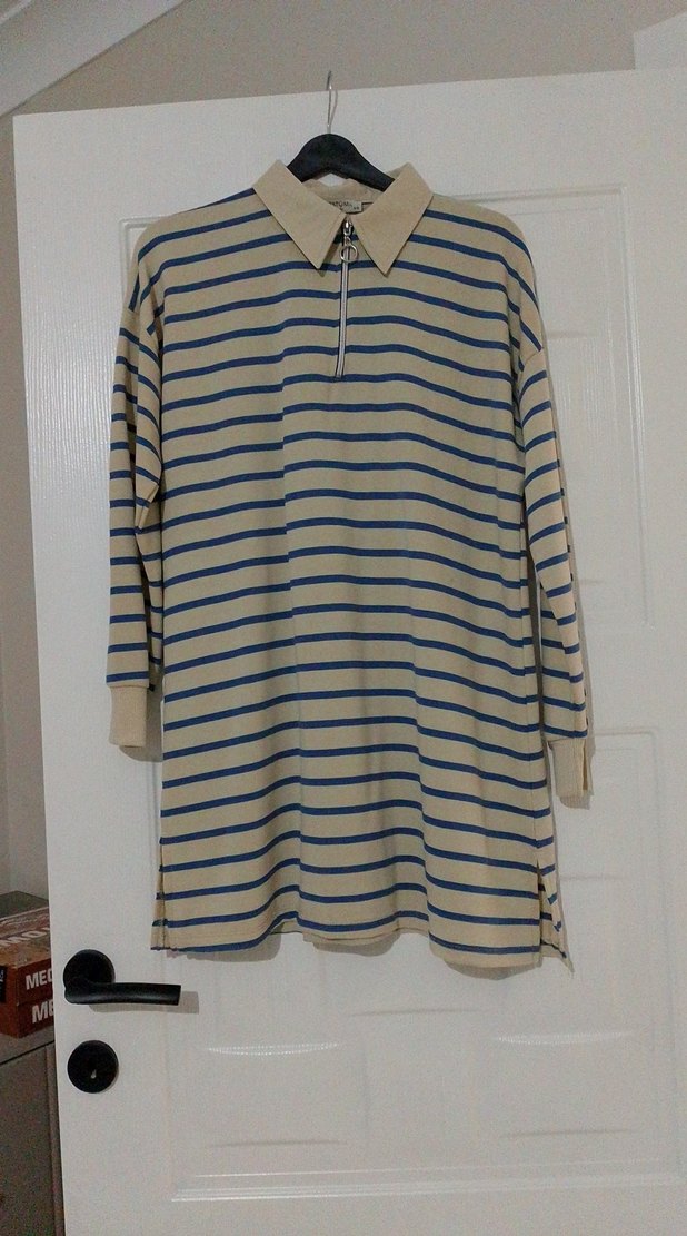 Uzun kollu, yakalı ve fermuarlı bej renkli hamile gömleği. Mavi çizgili, rahat kesimli ve yumuşak, sıcak kumaştan üretilmiştir.