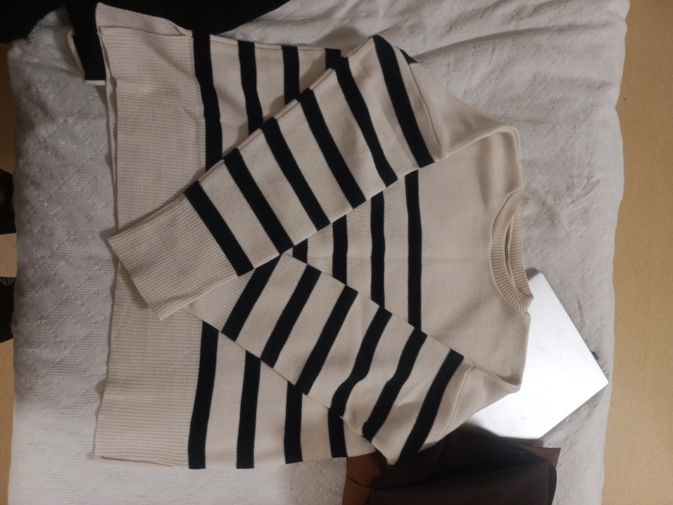 Fitted kesim, uzun kollu ve bisiklet yaka bu kadın triko kazak, sentetik örme kumaştan yapılmıştır. Bej zemin üzerinde gri çizgilerle günlük sokak tarzına uygundur.