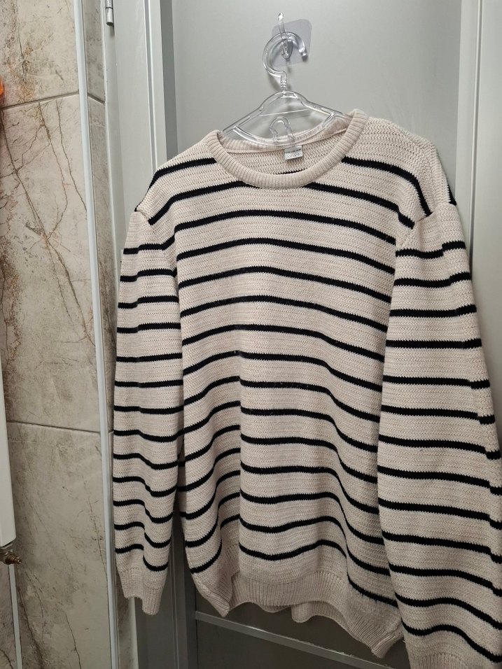 Bej renkli, çizgili, uzun kollu, yuvarlak yaka ve bol kesim kadın triko kazak. az kullanıldı 3xl