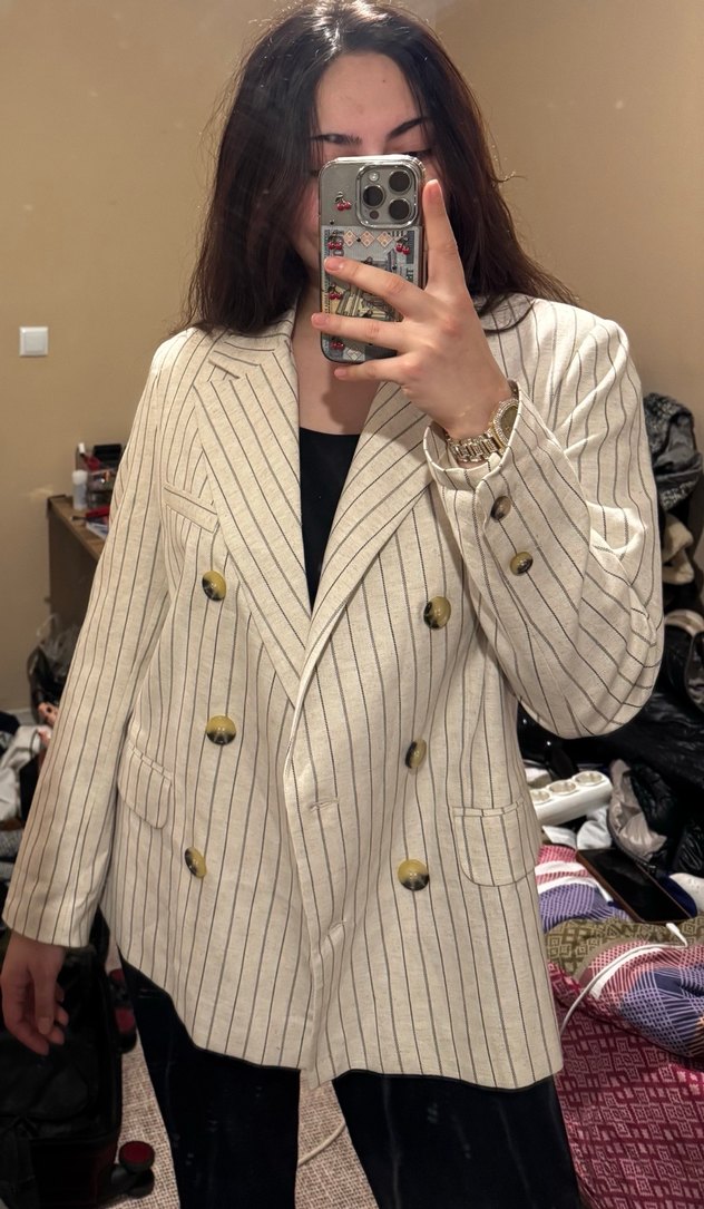 Çizgili Bej Keten Kadın Blazer