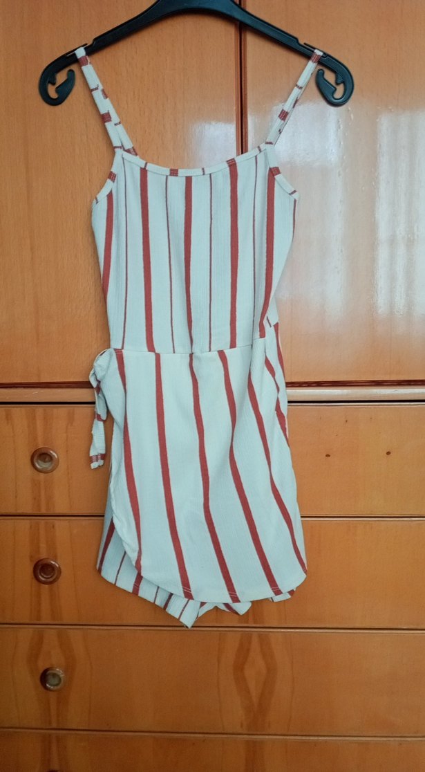 Bu kadın kısa tulum, ince askılı, belden kemerli ve pastel renkli çizgili desene sahip. Yumuşak sentetik kumaştan yapılmıştır, günlük kullanım için uygundur. Önde şort üzerine kroveze detaylı, likralı kumaş krem renk üzeri taba renginde boylama uzun çizgiler mevcut.Hic giyilmedi.Ambar marka.