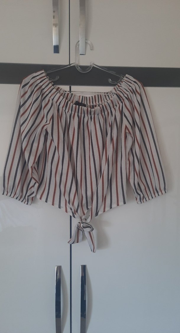 Bej renkli, çizgili mini bluz, kayık yaka ve bol kesimlidir. Pilili detaylara ve ince askılı kollara sahiptir. Rahat sentetik kumaştan üretilmiştir.