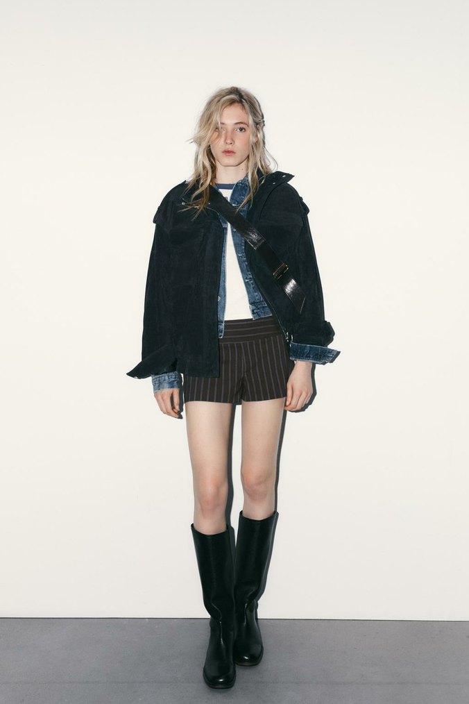 Çizgili desenli, bej renkli kısa denim ceket, bol kesim ve yakasında kesikli detaylarla günlük kullanıma uygun rahat bir şıklık sunar.