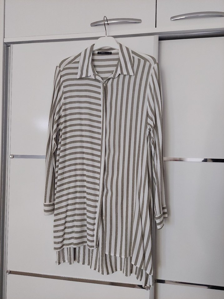 Yumuşak keten kumaştan, uzun kollu ve düğmeli, bej ve gri çizgili, salaş kesim midi uzunlukta kadın gömlek. Günlük rahat sokak stili için uygundur. ✨