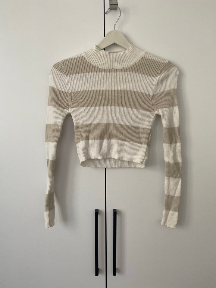 Uzun kollu, yarım balıkçı yakalı, bej ve gri çizgili, yumuşak triko dokulu, dar kesim bir kazak.