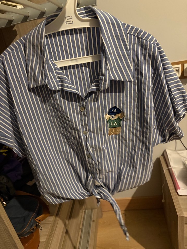 Bel kısmı kısa crop tarzı Düğmeli, kısa kollu, yakalı ve bol kesim kadın gömleği. Mavi ve gri çizgili desenli, önünde nakışlı patch ve bağlamalı uç detaylı. Günlük sokak stili için uygundur.