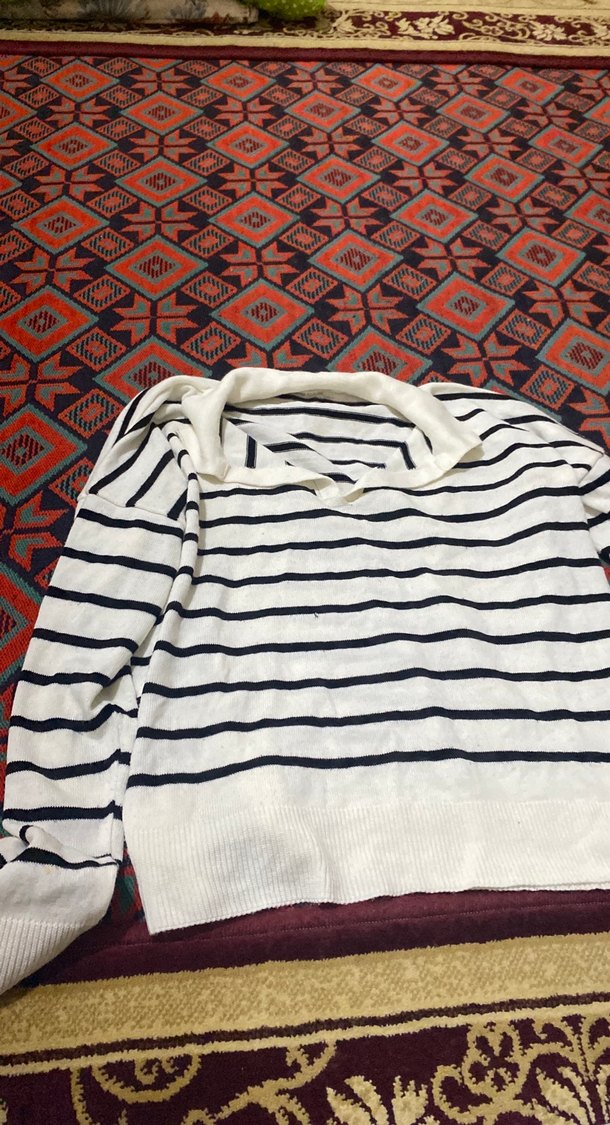 Kadınlar için uzun kollu, yakalı, pamuklu ve örme dokulu kazak. Beyaz ve gri çizgili, bol kesim, günlük rahat stil için uygun.