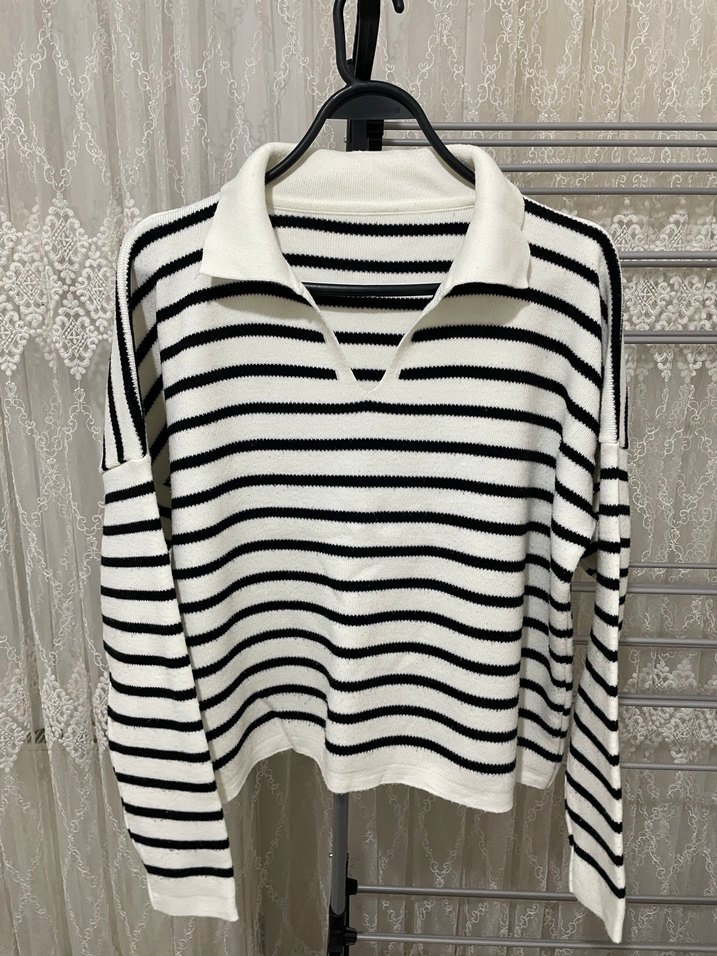 Uzun kollu, tekne yaka, gevşek kesim örgü kazak. Beyaz ve gri çizgili, günlük kullanıma uygun rahat bir parça.