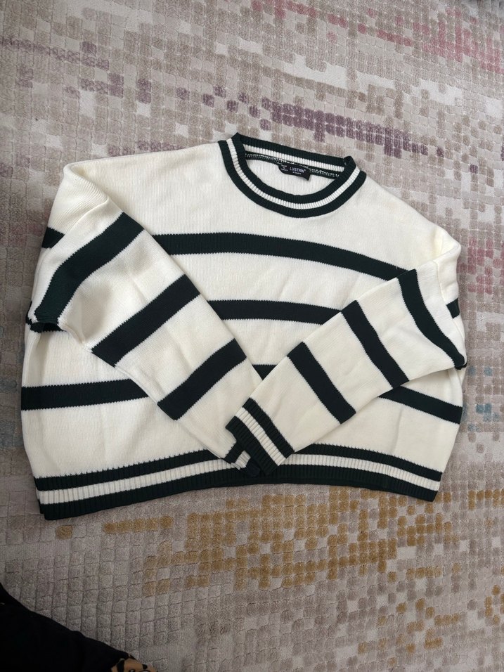Uzun kollu, yuvarlak yakalı, gevşek kesim örgü kadın kazak. Beyaz ve gri çizgili, rahat ve günlük sokak tarzı için uygundur. Hiç giyilmedi deforme yoktur